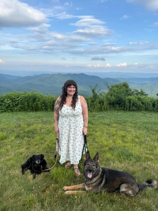 I have been around animals since the day I was born; they always have and always will be my passion and joy. I was born and raised in Brooklyn where I grew up with dogs, cats, birds and fish which instilled a deep love for all creatures. When I was 11 we moved to South Jersey, where I met Tyler. We attended Middle School and High School together. Though we only dated for a short time then, we remained friends into adulthood even though he had joined the Air Force and I went to college. I obtained my bachelor’s degree in Political Science with a concentration in Environmental Science and a minor in Literature from Stockton University. I thought I was going to be a journalist that righted all the wrongs of the world. Realizing soon after completing this degree that my efforts would be futile, I continued my work in customer service; I had already worked in various places since I was 15 such as hotels, a photography studio, a real estate office, and Wawa, where I worked through high school. I gained valuable skills and tools to ensure guest satisfaction, especially when something didn’t go well. I found myself in manager roles often, but knew my passion wasn’t in that industry despite loving building relationships with people. So, once I moved to Philadelphia after graduating, I began fostering dogs, cats and kittens. It was at this time that Tyler and I grew apart, having married other people and lived very far apart (he ended up in Japan and then Italy). I decided to go back to school and perhaps save the world in a different way; I attended Penn State in hopes of doing conservation work. I completed two years of the biology program where I did field research on the Eastern Meadowlark, and then got the wild hair to move across the country. So, I spent 11 years in Washington state exploring the West, hiking, road tripping, camping, kayaking, traveling the world, and making incredible memories and friends. It was there that I continued fostering which lead to jobs as an adoption counselor, a foster coordinator, an adoptions and volunteer manager and eventually starting my own pet care business, Pawsperous Pet Care. During that time I lived on a micro farm in Skagit Valley where I had chickens, pot bellied pigs, and gardens. Pawsperous Pet Care was fully fledged and successful when Tyler and I reconnected. And of course, he lived on the opposite side of the country. Despite swearing that the West is the Best and never wanting to move back to the heat and humidity of the East, I found myself living in South Carolina a year ago. That was after we traveled back and forth for half a year to see one another—one of those trips was to Asheville and it was on that trip that I fell in love with this city and the breathtaking surroundings. So, once Tyler officially retired, we moved our home on wheels here! All that to say, we are literally living our dream life! Tyler and I love to hike and kayak together with our dogs, Bear and Octavia. We are insatiable foodies and feel like we have found Mecca! And when we aren’t pursuing our passions (he also details cars and used to own his own business which we hope to revive in the future), we can be found cuddling with our three cats, Yoshi, Alistair and Astrid. In my not-so-abundant downtime, I also love to bake, garden, read romantasy books, stroll the arboretum, shop and support local makers, and road trip to new places!